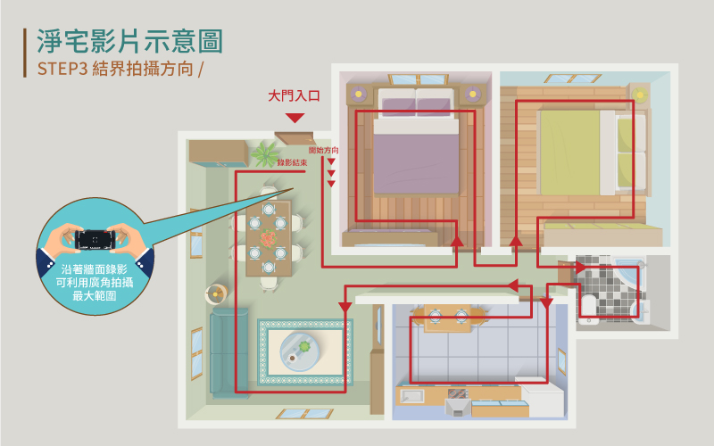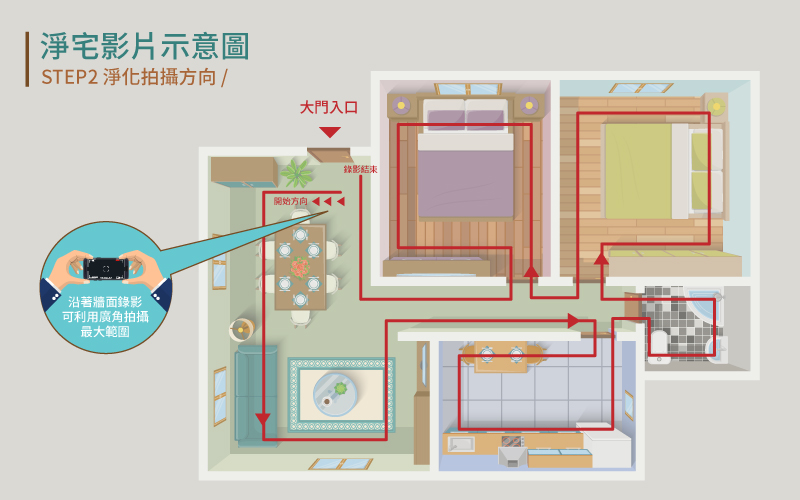 Step2. 站在屋內,面對大門,從大門口沿著牆壁,往左邊(順時鐘)拍攝,沿著牆壁走,走一圈回到大門。