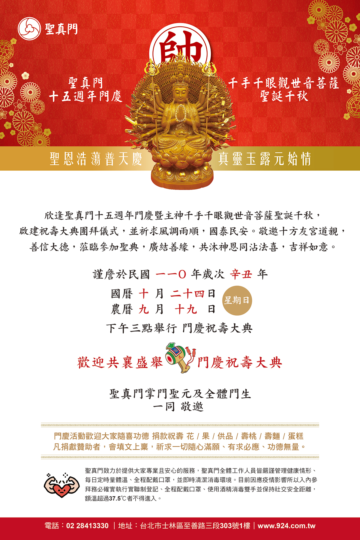 欣逢聖真門十五週年門慶暨主神千手千眼觀世音菩薩聖誕千秋, 啟建祝壽大典團拜儀式,並祈求風調雨順,國泰民安。敬邀十方友宮道親, 善信大德,蒞臨參加聖典,廣結善緣,共沐神恩同沾法喜,吉祥如意。