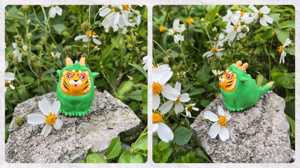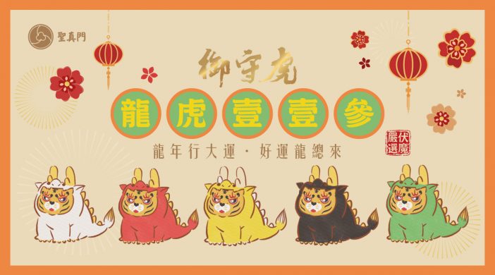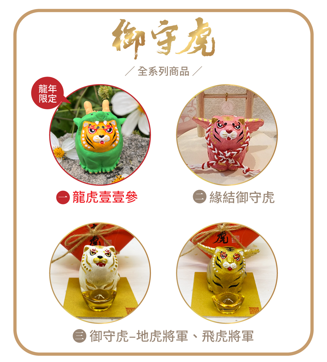 御守虎是聖真門虎爺的守護象徵公仔,隨著龍年的來臨, 御守虎也搖身一變,加上可愛龍衣外觀,期望祝福大家龍年 都可以得到眾神護佑,龍年樂逍遙·吉祥龍添瑞。今天以『龍虎壹壹參』的型態,取其守護之意, 手工製作彩繪,限量與大家結緣,期望能招財進寶, 鎮煞驅邪,一切平安吉祥。