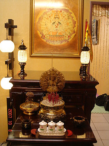 當初,只供奉神明的法相,這張千手觀音是聖元從一位師姊那裏請來的,最早是放在家裡自己供奉的,成立道場,便請到道場來與大家結緣。(沒有錯,一開始就是這麼艱辛阿!連占卜的桌子椅子都是我台中象棋卦老師沈老師無償贈送,而且還在半夜和一位師兄載來給我的,現在想到還是揪甘心阿!)
