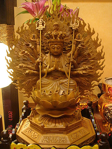 後來一直到半年後,有一位通靈的師兄,跟我說,有人會請一尊木頭的千手觀音來結緣,當下的我其實沒有多想些什麼?還是抱持著順其自然的態度,反正到時候就會知道了吧!幾個月過去,遲遲等不到菩薩來結緣,這樣的預言我以為不會成真,直至有一天跟一位年長的客人聊起,她提到說,的確如果拜拜可以換正式的神桌供佛應該會比較好,於是我才興起了念頭,想要真的找一尊千手觀音的金尊,讓道場升級。
