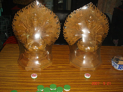 將二尊千手觀音菩薩佛像放置桌上,我自己心理其實有點緊張,坦白說,也不知道在緊張什麼?一方面怕菩薩太小尊,一方面又不好意思婉拒別人的熱情(他的老師都以母娘姿態說與我們有緣了,如果我們說沒有,不請走菩薩,豈不是有拆母娘台的意味?)但是既來之,則安之。是我一直以來的信仰理念,那就且戰且走吧!於是看看桌上的菩薩,哪尊感覺比較順眼,應該是比較合緣的。(聖元當初看到的是左邊那尊千手觀音比較合緣,不知道是不是錯覺?還真的覺得菩薩面貌猛一看與我似乎頗有相似之處。)