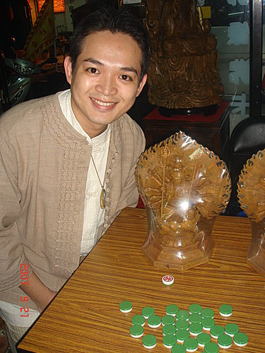 接著我在心中呼請靈自在修心苑內的觀音菩薩做主,若這裡的菩薩佛像真有緣跟我們,請予以指示。在二尊觀音佛像前,我各選出一顆棋,順勢先翻左邊的棋子(因為我個人比較喜歡這一尊),一翻開,乖乖隆地咚,我立刻跳起來,因為當時心理覺得此事要翻帥才比較讓我信服。因為帥代表的就是觀音菩薩。沒想到,這顆象棋一翻開,便是一直認為很難翻到的帥棋,紮紮實實的『帥』便出現在眼前。