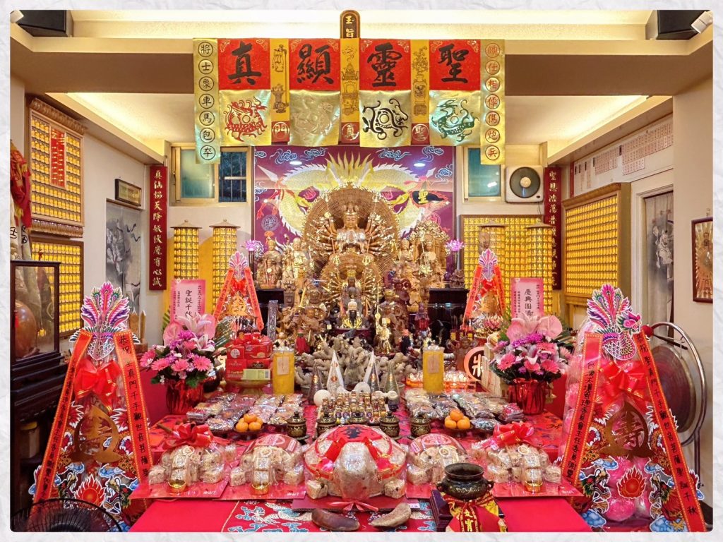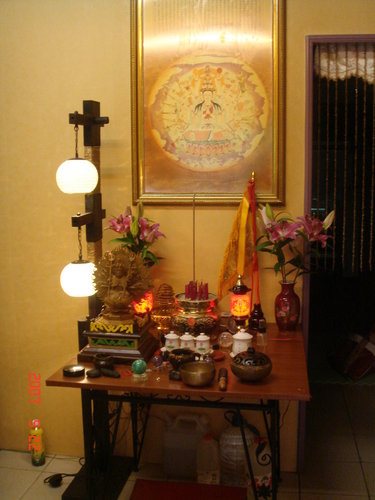 剛開始,牆壁上掛著一張裱好框的千手觀音印刷圖畫,一張從租屋處結緣來的只有鐵架的桌子框架,然後一位藝人朋友和我一起去特力屋割了90公分乘以90公分的正方形木板當作鐵製框架的桌板,上面貼著同樣從特力屋購買的木皮貼紙,就這樣,放上香爐,一對燈,三杯水,這就是最初我所供奉的千手觀音神壇。