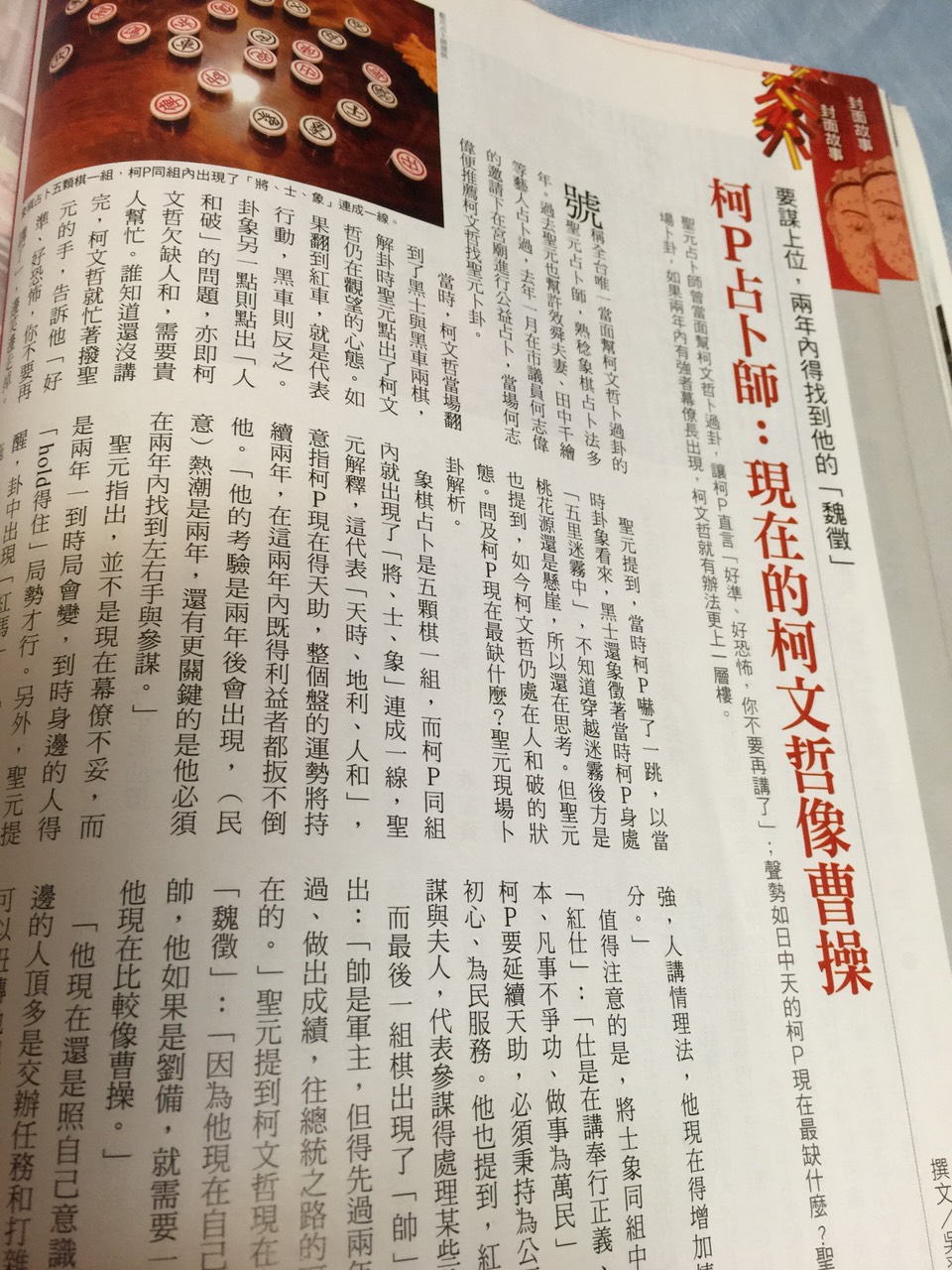 年前,聖元接受訪問,上了<新新聞>雜誌,原因是,{我可能是唯一一位親自幫柯文哲用象棋占卜的命理老師},而因著他後來當選市長,話題性充足,也沾了一下光。