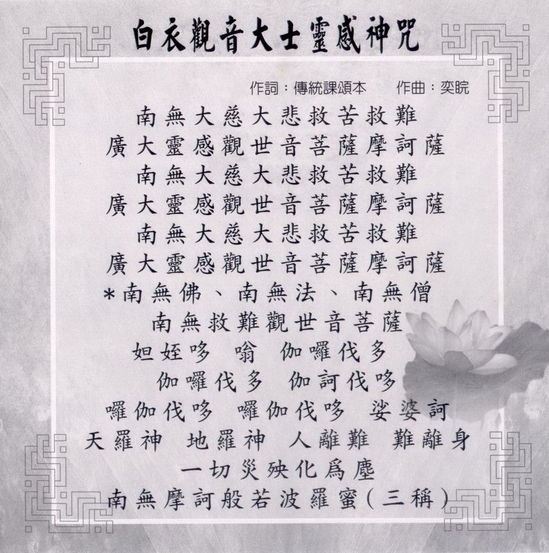 白衣大士神咒,小學時,我在一間廟的善書結緣區拿到的第一本善書,我記得內容中還有太陽星君真經,太陰星君真經一起,從小,我就很喜歡念這樣短短的經咒,總覺得菩薩很靈驗,一定會加持,有求必應,然後,每一次考試的時候,我都會很努力練經咒,祈求考試順利!就這樣,一路念到了專科畢業!