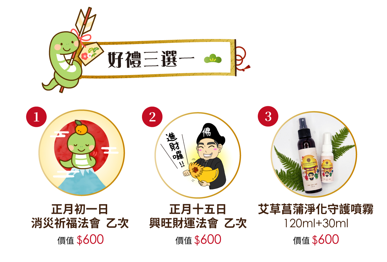 即日起至114年1月24日(農曆甲辰年12月25日)前,只要奉點光明燈全餐 (共七燈) 即贈送➡好禮三選一!以下任選一個項目免費贈送給您!