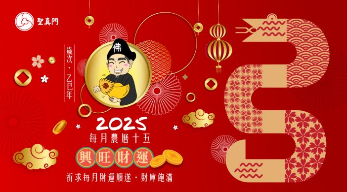 聖真門的神明也希望大家不要困於金錢需求而產生煩惱,可以隨濟公師父,自在開心的精神,對金錢也能逍遙自在。所以訂於每月農曆十五這天,聖真門特舉辦興旺財運法會,此法會由濟公師父主持,然後邀請文武財神,土地公一起來給予協助,祈求讓各位財運順遂,財庫飽滿。