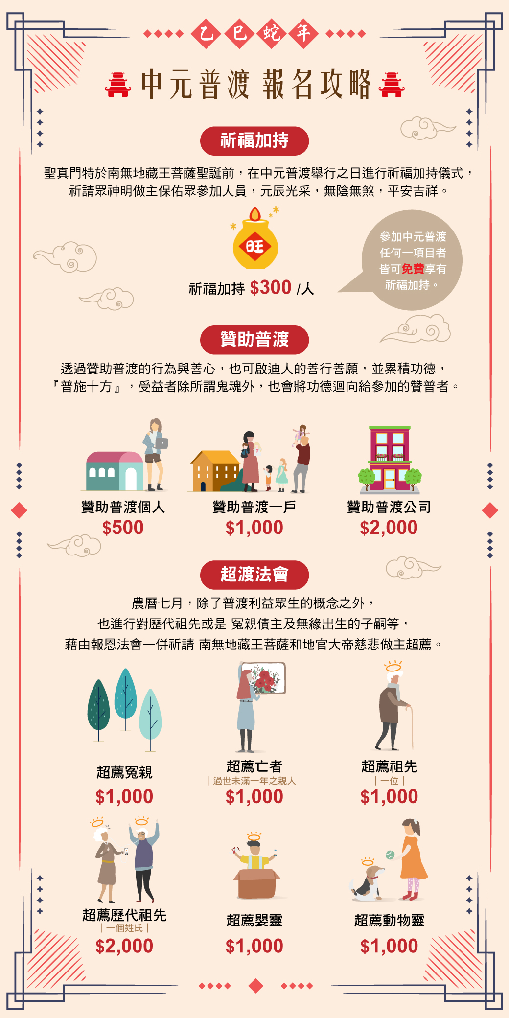參加中元普渡任何一項目者,皆可免費享有祈福加持。(以陽上報名人一位為主)