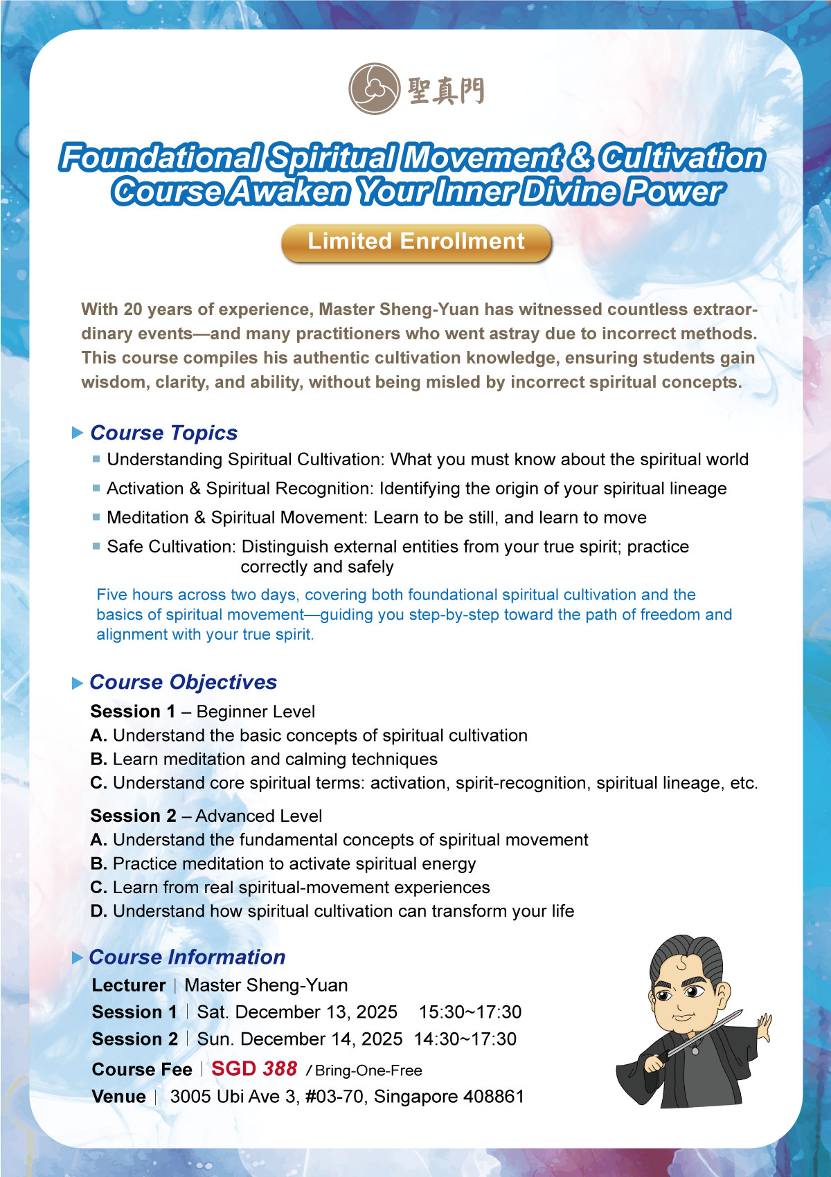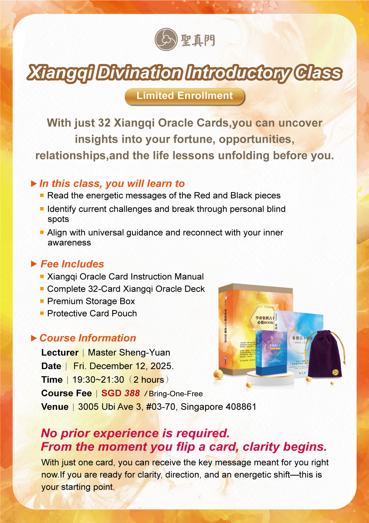 为回应新加坡朋友的热情,圣真门将于 2025.12.10–12.15 再度启程,并首次在新加坡开设实体课程,抢先推出象棋占卜入门与灵动灵修两大重点课程,带领大家学习解惑人生的智慧与提升能量觉察。活动期间亦提供象棋占卜、风水堪舆、屋宅净化等服务,名额有限,欢迎把握机会预约。这么难得的活动,您绝对不能错过!