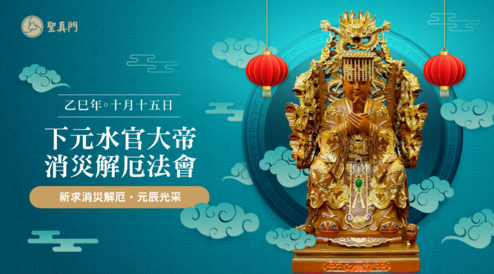 農曆10月15日為下元節,也是下元三品水官解厄洞陰大帝聖誕,聖真門特舉辦消災解厄法會。三官大帝中水官大帝,全稱「下元三品五炁解厄水官金靈洞陰大帝暘谷帝君」,亦稱為水官、洞陰大帝、下元三品解厄水官洞陰大帝。是道教中三官大帝之一,水官是由風澤之氣、晨浩之精凝結而成,掌管水帝暘穀神王,九江水府河伯神仙,水中諸大神及仙籙簿籍。傳說「水官解厄」,農曆十月十五日是水官的誕辰,民間稱這一天為下元節,並在這一天請神明為運勢不好的人消災解厄,元辰光采。