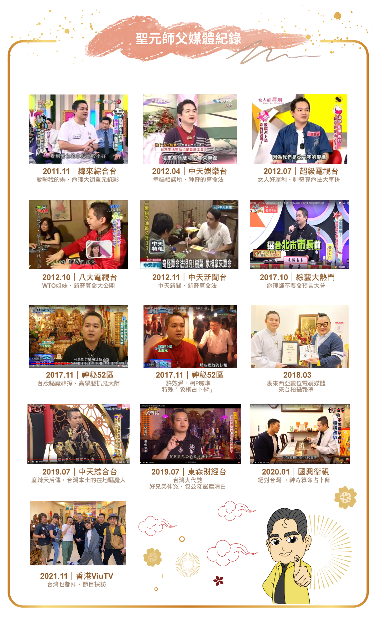 🔸壹新聞、三立新聞、中天新聞、八大電視台、超級電視台、中天娛樂台、緯來綜合台、蘋果日報、第一手報導、自由時報、多家新聞電視、娛樂節目邀請介紹占卜老師。