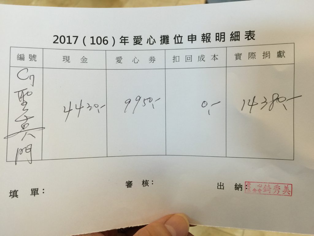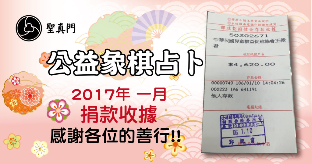(公益)象棋占卜 活動紀錄與捐款 <聖真門 伏魔師> 2017-02-062017-02-06 伏魔師 聖元 (公益)占卜活動 2017年1月份 ☑️妞妞義麵屋 4620元 ☑️屏東何宅(昭明宮籌備處) 3400元 ☑️關明堂 3700元 (2017公益捐款合計 11720元) 2017年2月份 ☑️松山慈惠堂愛心基金會 14380元 (2017公益捐款合計 26100元)