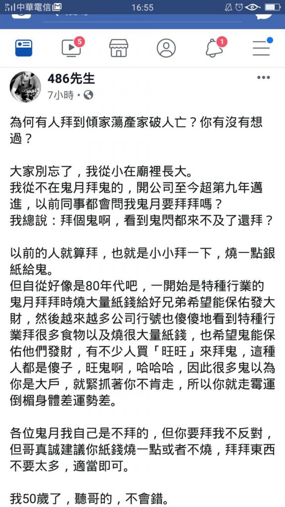 回486先生文章,鬼月普度,拜鬼有它的民俗意義與宗教道理,拜的正確,了解正確很重要 2019-08-19 伏魔師 聖元 (觀點)伏魔師看世界 鬼月拜鬼….民俗上應該指的是普渡,不過我覺得486先生說的,我可以理解,只是用比較誇張的說法來陳述,拜拜要有正確的知識。 普渡…通常主要是拜神,佛教道教各有不同神明與普渡有關,佛教大概有地藏王菩薩,觀世音菩薩;道教有太乙救苦天尊,閻羅天子;民俗上有普渡公,面燃大士說法等。 拜神,祈求神佑,或祈求超渡有緣無形眾生等,利用普度的時候,談經說法,這有它民俗上的意義,你問我有沒有效?坦白說,從能量的角度來說,的確有道理。 普渡通常為的是讓孤魂野鬼得受香火供養,而利用它們利祭品的時候,談經說法,希望它們能夠頓悟或是跟隨眾神而去,有機緣可以進入修行直至解脫。 能量上來說,大家的信念與相信的確可以產生作用力,而孤魂野鬼若能接受普渡而得以安息離去,也的確可以減低一些負面能量對於人類的影響。 但,拜拜,的確要有智慧與知識。 拜到家破人亡,一定有地方出問題,就像聖元常說,修行理應越來越好,如果修行越修越不好,必然有地方出問題,必須要好好調整修正。 鬼月祭祀的文化,拜的正確,我相信必然會得到神佑與加持。 如果只是一昧亂求鬼相助,請鬼拿藥單,必然有風險。 這也是486先生此篇最想說明的地方吧! 總之,拜拜要正確,多拜或少拜,見仁見智,看你的需求與意義是甚麼吧? 相關道理與伏魔師的看法,聖元再拍影片補充說明了,以上文章,僅提供大家參考先阿。