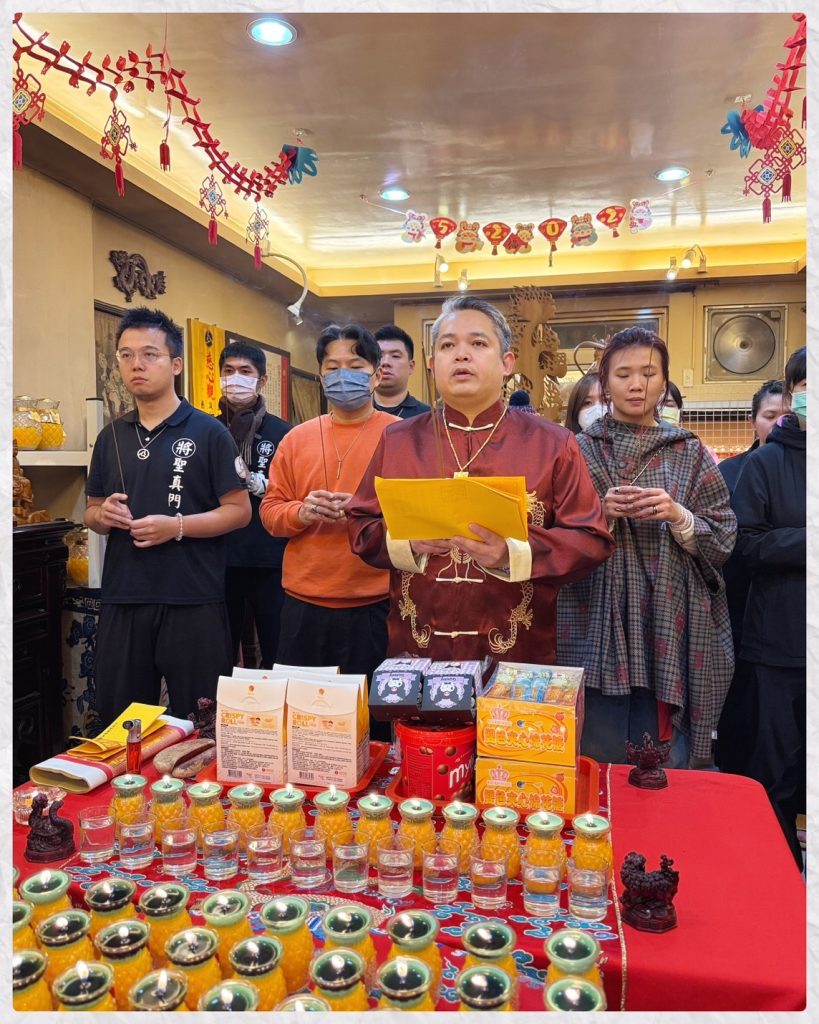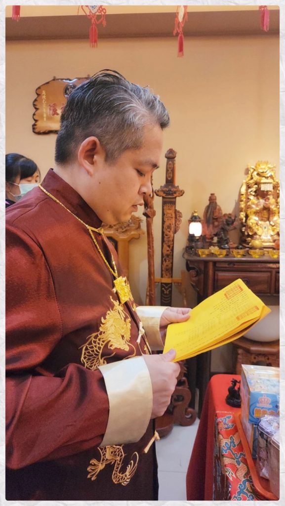 由聖元師父祈請眾神護佑,稟上法壇聖務疏文,加持光明燈儀式一切順利圓滿。