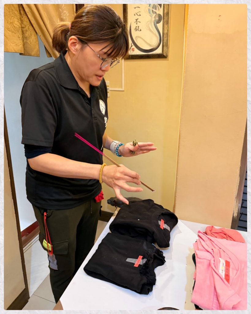 由弟子一一幫每位參加善信的衣服加持,並且一一翻牌確認是否圓滿。